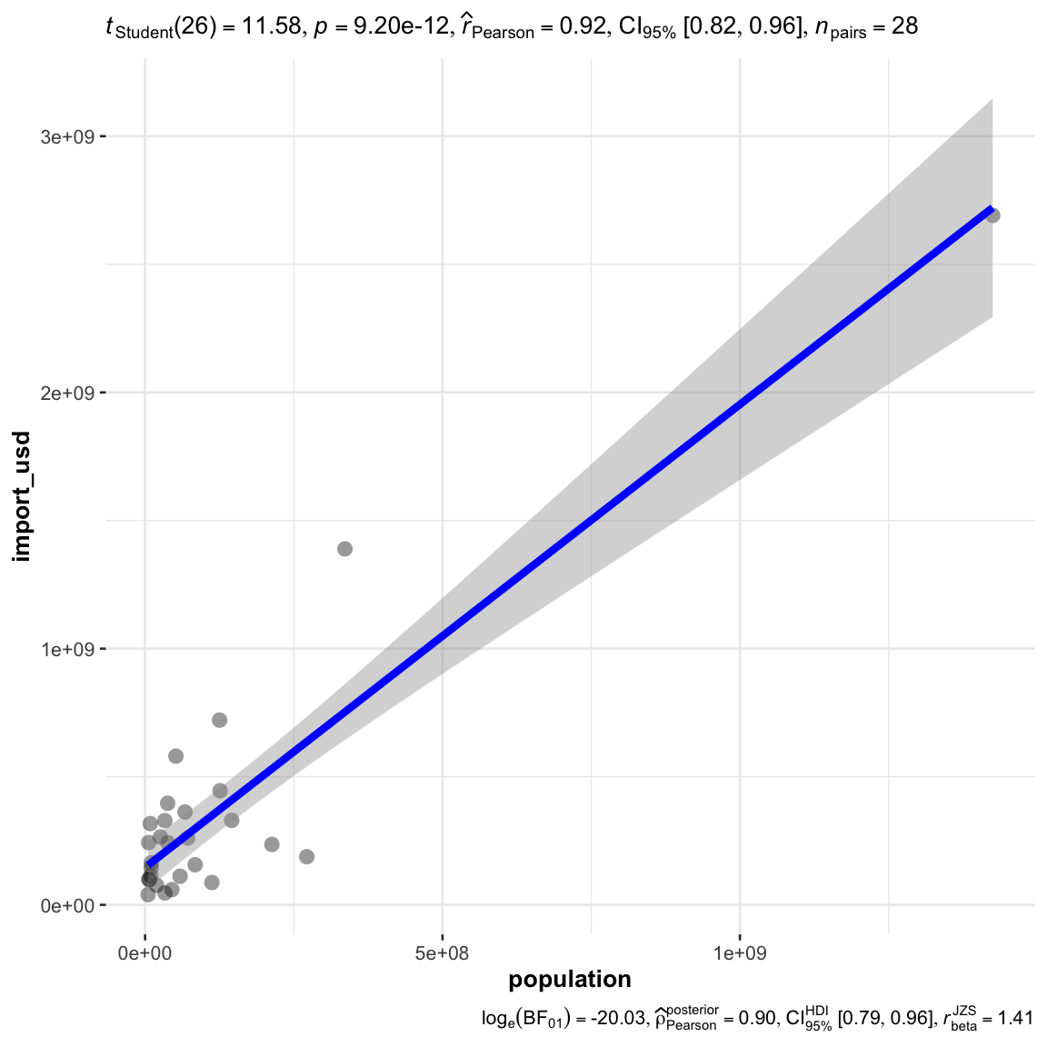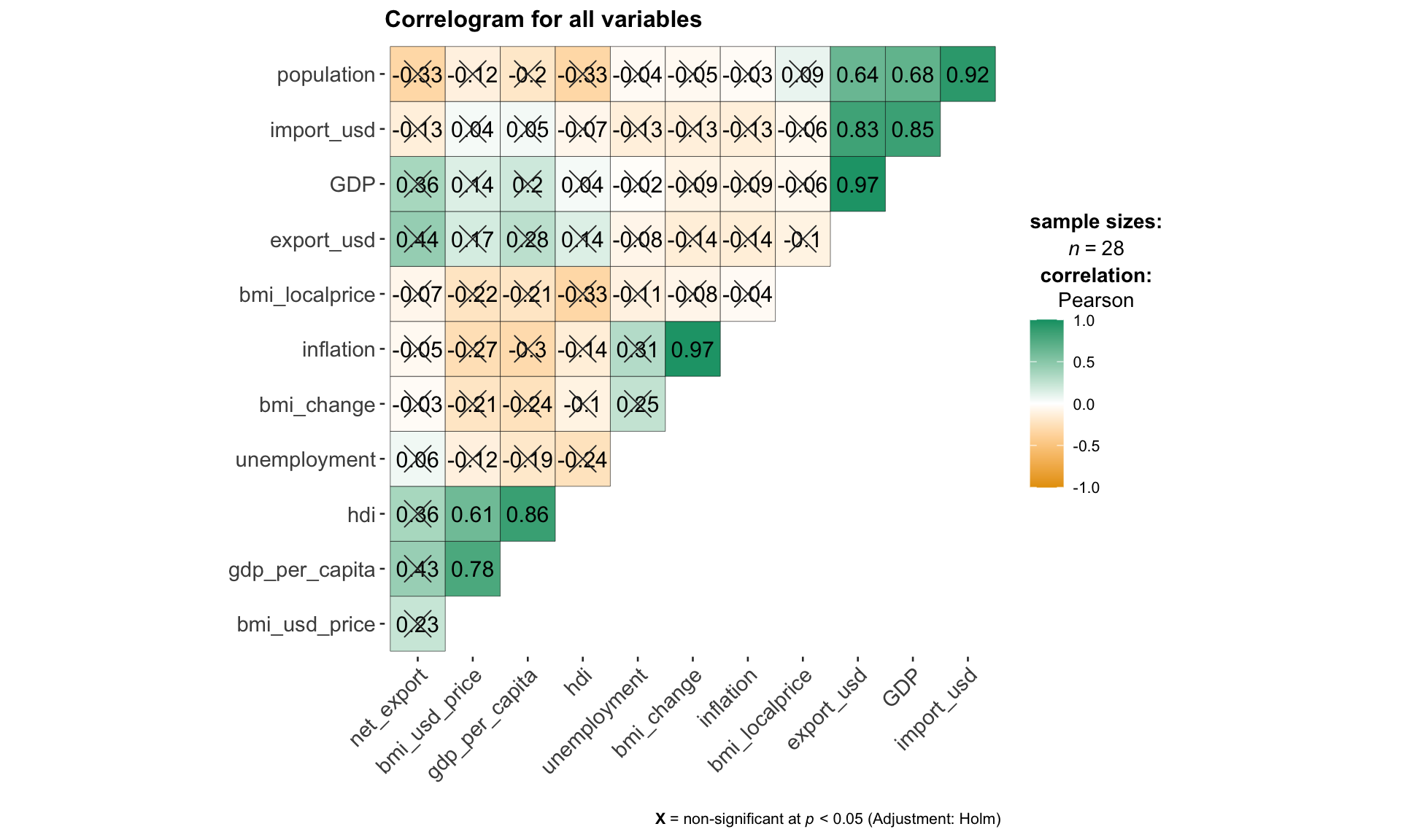 select(-year)The code chunk below use ggcorrmat()from ggstatsplot package to visualize the collinearity between all continuous variables. This step is essential in the selection and filtering of variables for subsequent hierarchical clustering, so that the user can exclude highly correlated variables while building the model.